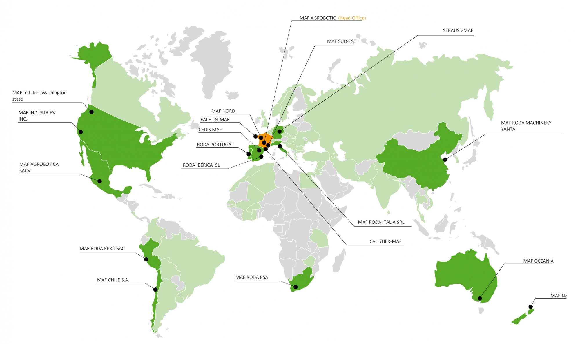 En tant que N°1 mondial incontesté des process de calibrage, de conditionnement et de manutention dans le domaine des fruits et légumes frais, nous nous engageons à vous apporter des solutions performantes, adaptées à votre juste besoin, et évolutives pour accompagner votre développement futur. La force de MAF RODA repose sur la grande capacité d’innovation de son service R&D, dont le coeur est en France à Montauban, sur sa parfaite maîtrise technologique et la fabrication 100% intégrée de tous les équipements qui lui permettent de trouver des solutions à toutes les demandes, de la plus simple à la plus complète et exigeante.
